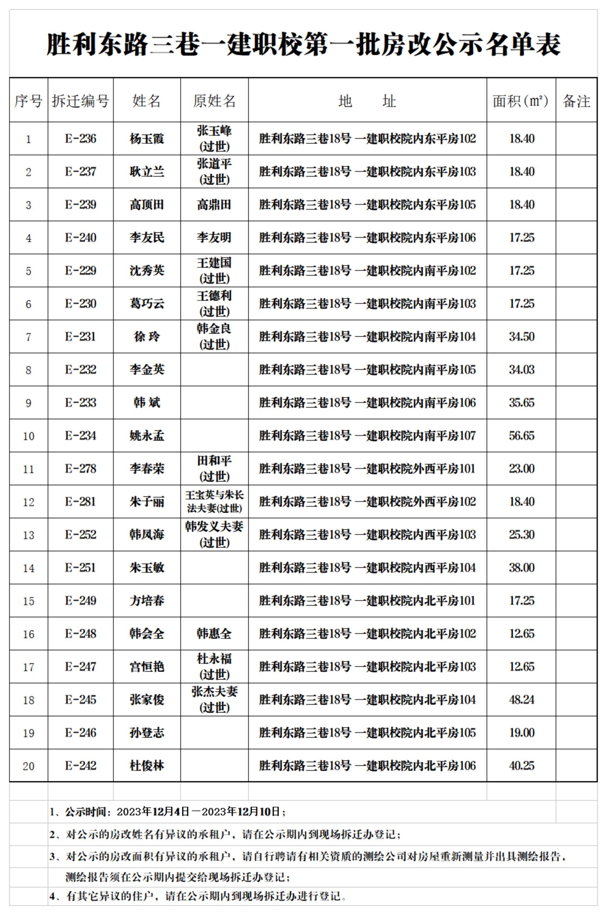勝利東路三巷一建職校第一批房改公示名單表