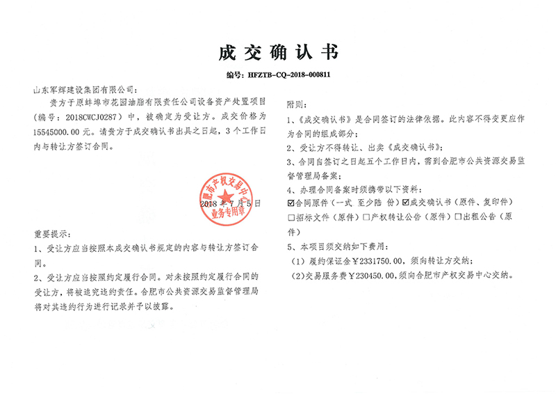 原蚌埠市花園油脂有限責任公司設(shè)備資產(chǎn)處置項目成交公告