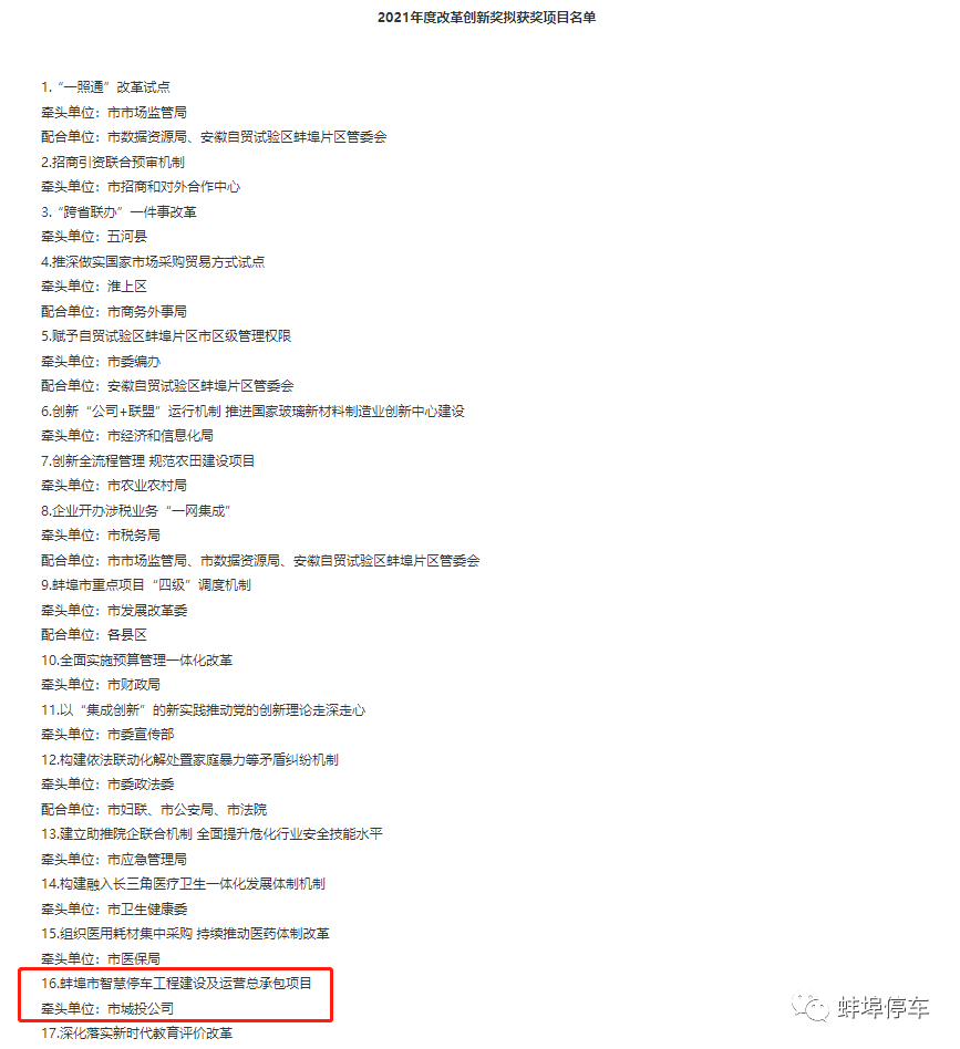 轉(zhuǎn)載:蚌埠市人民政府《2021年度改革創(chuàng)新獎擬獲獎項目公示》