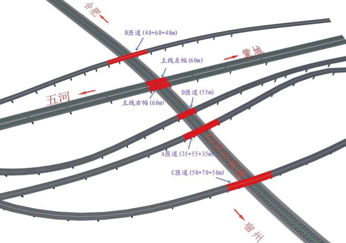 五蒙高速包集樞紐共有5座橋梁上跨G3京臺(tái)高速工程,分別為主線特大橋,A、B、C、D匝道橋,采用55m、60m、70m鋼箱梁單跨跨越京臺(tái)高速,為G3京臺(tái)高速預(yù)留出“四改八”條件。