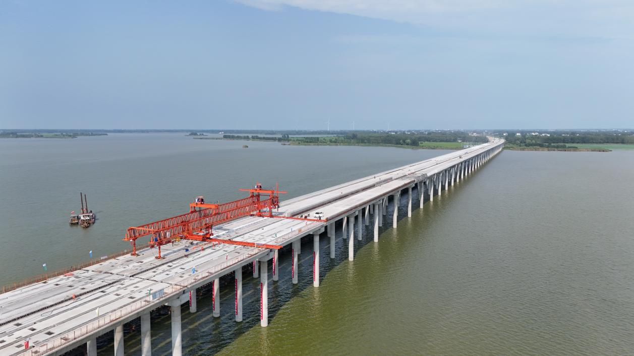 此次貫通的沱湖特大橋是蚌埠城投五蒙高速公路項(xiàng)目重要控制性工程,也是全線最長(zhǎng)的橋梁,由中交第二航務(wù)局承建。大橋西起申集鎮(zhèn)彭集村,向東跨越沱湖至雙忠廟鎮(zhèn)阮圩村。橋面主體全長(zhǎng)3153米,寬27米,為雙向四車(chē)道,跨越省級(jí)自然保護(hù)區(qū)沱湖,具有環(huán)保要求高,施工難度大等特點(diǎn)。
