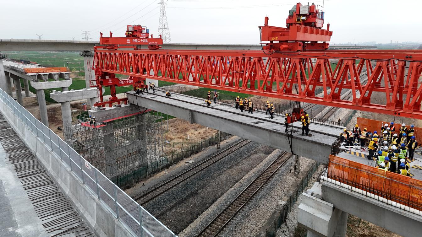 項目位于蚌埠市固鎮(zhèn)縣,全長1.988千米,由中鐵二十四局負責項目實施。京滬鐵路每日通行約140對列車,為確保鐵路運營不受干擾,單日封鎖施工時間有限,需要在100分鐘內完成兩片高2米、長40米、重170噸的箱梁架設任務,施工難度高、安全風險大。